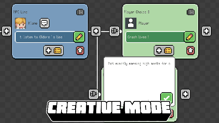 Creative mode is an open sandbox where you are free to create the RPG world of your dreams without restrictions or studio management gameplay. Write stories, create dialogue trees and cutscenes, draw characters, and finely tune gameplay mechanics as you craft your masterpiece.